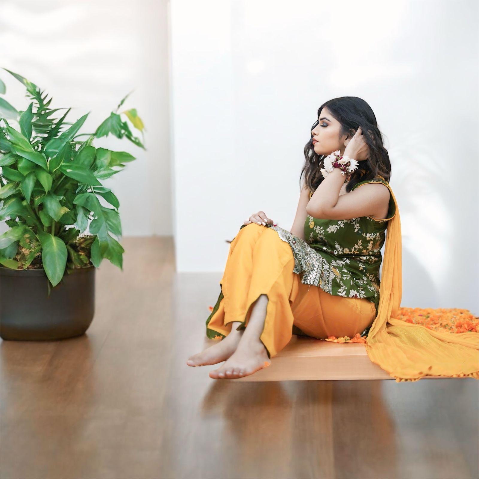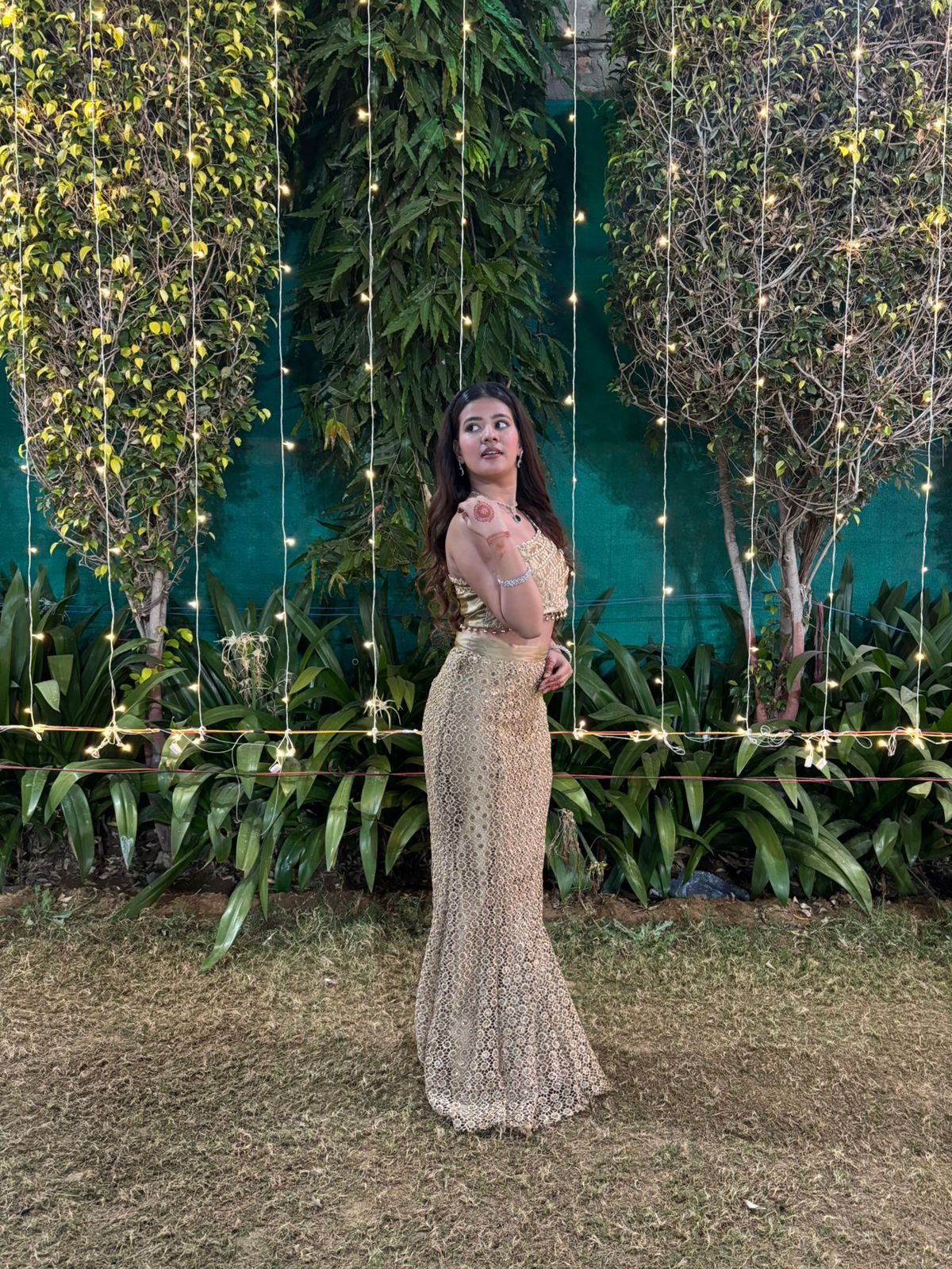 This piece is a client’s customised creation, beautifully handcrafted in rich brocade fabric. The intricate floral patterns enhance its elegance, making it perfect for festive and special occasions. A true blend of tradition and trend, designed with precision and care.